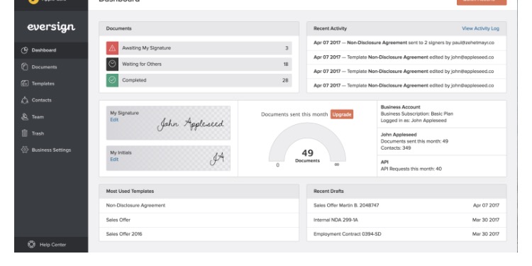 最初にアカウントを作成すると、すべての文書と署名を表示、アップロード、作成、管理できるすっきりしたWebインターフェイスであるEversignダッシュボードに移動します。