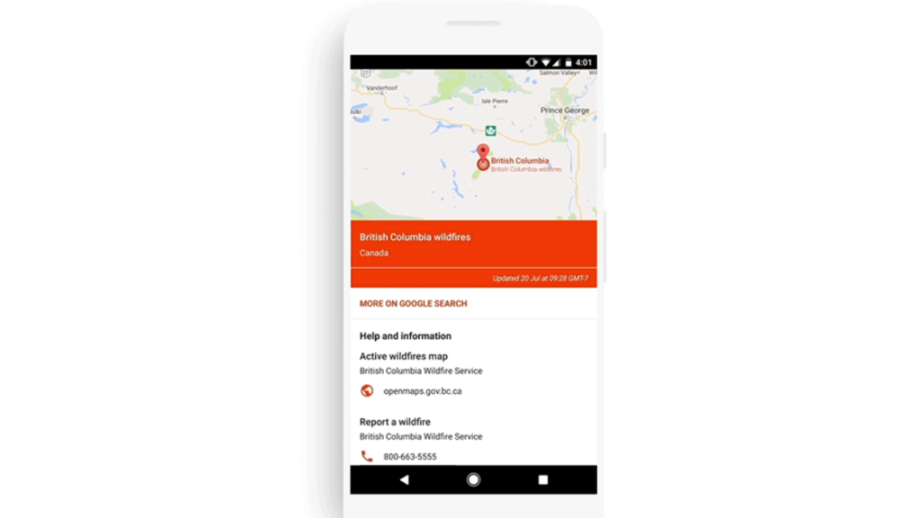 Googleマップ上のSOSアラートについては、危機が発生している場所に表示される新しいSOSアラートアイコンが表示されるようになりました。 SOS Alertアイコンをタップすると、イベント中に役立つウェブサイトと電話番号のカードが表示され、道路閉鎖などのリアルタイム交通情報も更新されます。