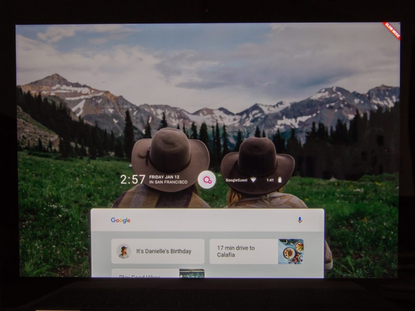 Linux以外、カーネルOSへの最後の挑戦はAndroid APKによるもので、Arsのハンズオンでは、時間を表示する基本的なものと、左上のフクシアのロゴと、電話とデスクトップ/タブレットモードを切り替える機能、反対側の角に位置する機能は、WiFiコントロールとログインでした。