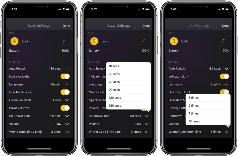 Assure独自のYale Secureアプリは、自動再ロック、ワンタッチロック、誤ったコード入力制限、スピーカー音量などの設定に関する追加の設定オプションを提供します。これらの設定のすべてではないにしても、大部分はタッチスクリーンのキーパッドメニューから手動で設定できます。