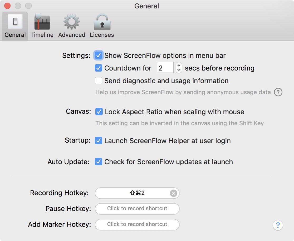 ScreenFlow設定の「General」タブで、カウントダウンを2秒に変更します。これにより、画面録画をすばやく開始することができます。