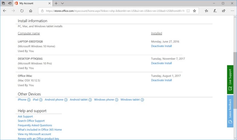 次のページで、少し下にスクロールすると、Install Informationというセクションが表示されます。この項目では、Office 365アカウントが現在アクティブ化されているすべてのデバイス(サブスクリプションの一部としてOfficeアプリケーションをダウンロードしてインストールしたPC、Mac、タブレット)が一覧表示されます。