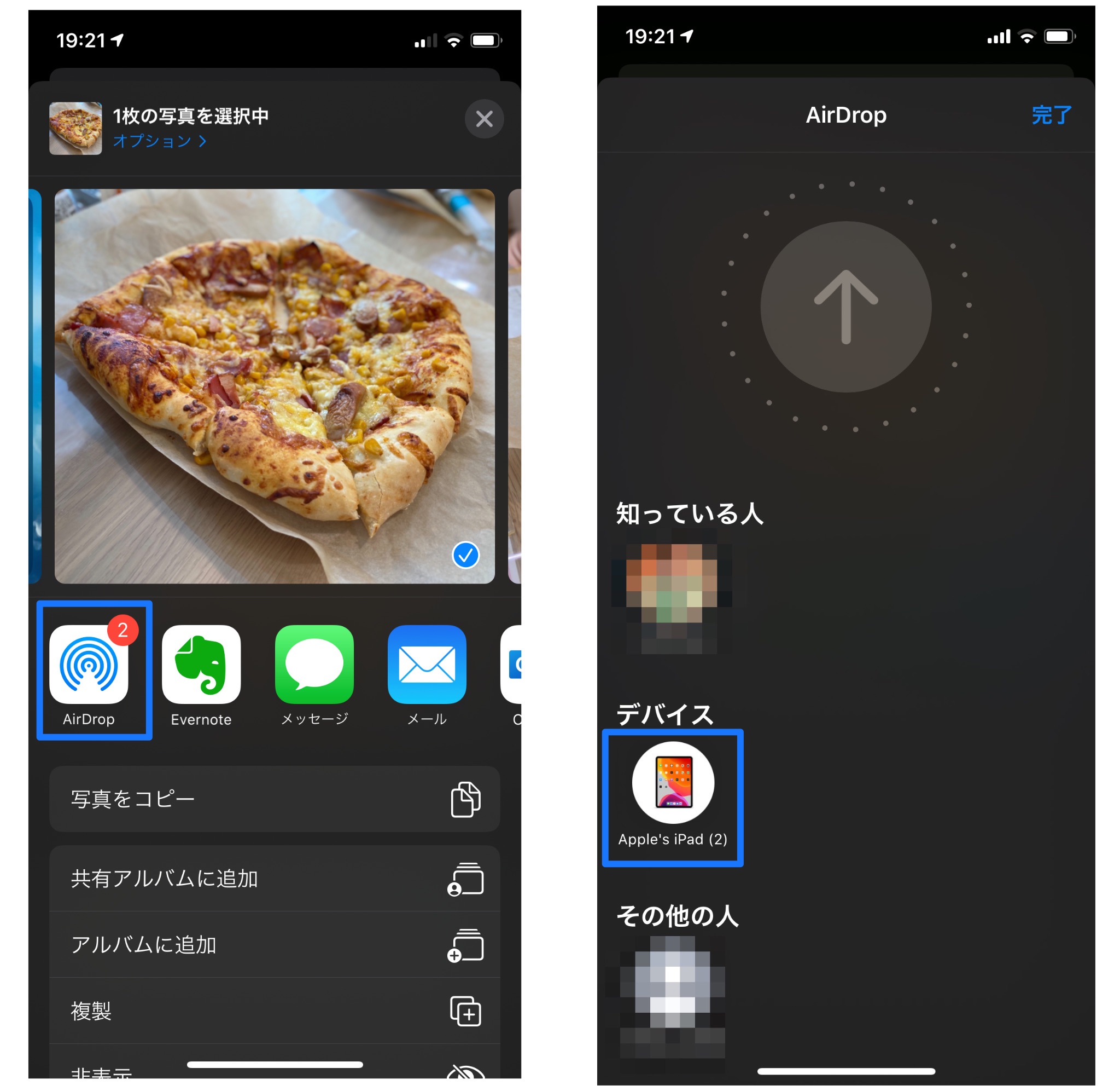 - AirDropで転送可能なデバイスがあると「AirDrop」アイコンが表示されます。